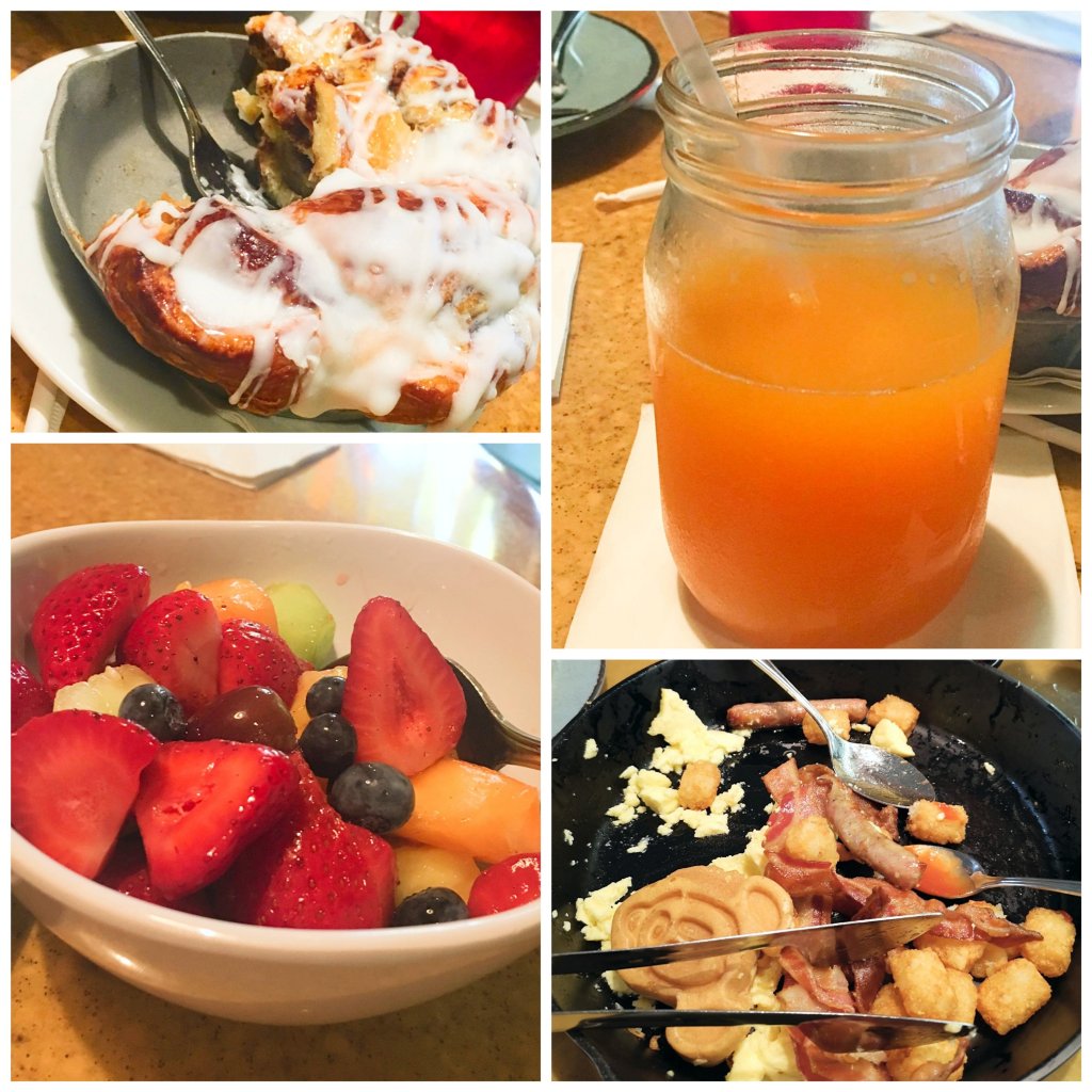 Food wise for breakfast you get Chips sticky cinnamon bun, and a bowl of mixed fruits to start off with before a cast member brings you a skillet of breakfast foods – bacon, sausage, eggs, mini potato hashes and waffles. You also get chocolate sauce and syrup for the waffles and a salsa for the potato hashes. The food here is served ‘family style’ where it is brought to your table to share and you are offered a top up when you appear to be running low.