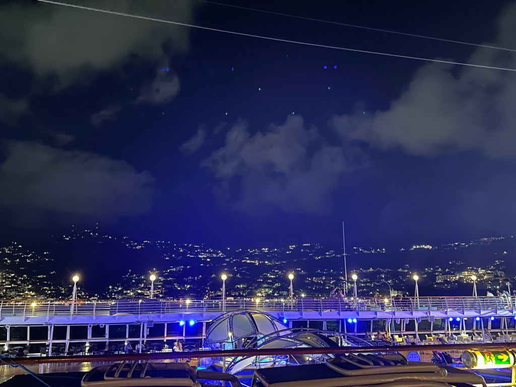 We also took the opportunity to watch the sail away as we missed it the evening before. Due to the immigration we were in port until 8:00pm, so we had plenty of time to get to deck to see us push off. The island in the evening was stunning! All the small lights around the island and the harbour were just magical.